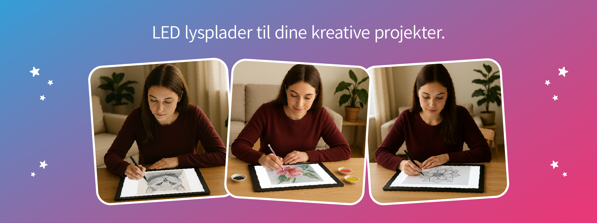 Oplev glæden ved at skabe med præcision og ro. Vores LED lysplade giver et jævnt, behageligt lys, som gør det nemt at overføre motiver, tegne eller arbejde med teknikker som mal-med-prikker, diamond painting eller skitsering.